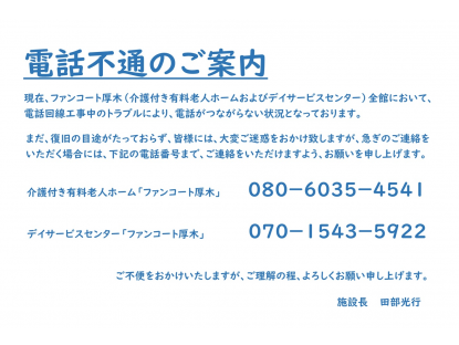 皆様へのご案内 現在、ファンコート厚木(介護付き有料老人ホーム/デイサービスセンター)では、 電話回線工事中のトラブルにより、電話がつながらない状況となっております。 まだ、復...